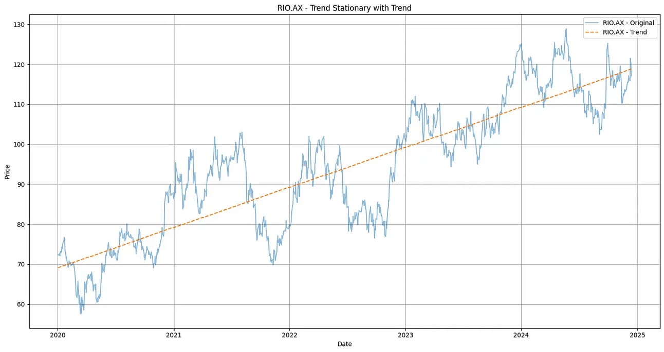 This more sophisticated analysis identifies trend-stationary stocks — those follow predictable patterns around a trend line rather than a flat mean. It works by: