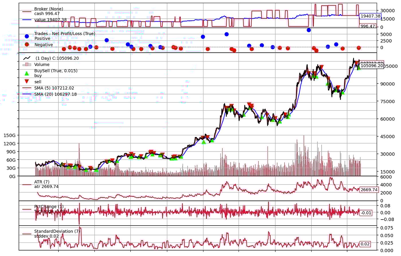 Here’s how we set up and run the backtest using yfinance to fetch Bitcoin data and cerebro to orchestrate the simulation.
