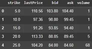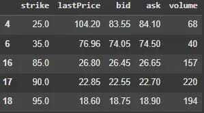 calls_df = option_chain.calls[['strike', 'lastPrice', 'bid', 'ask', 'volume']]