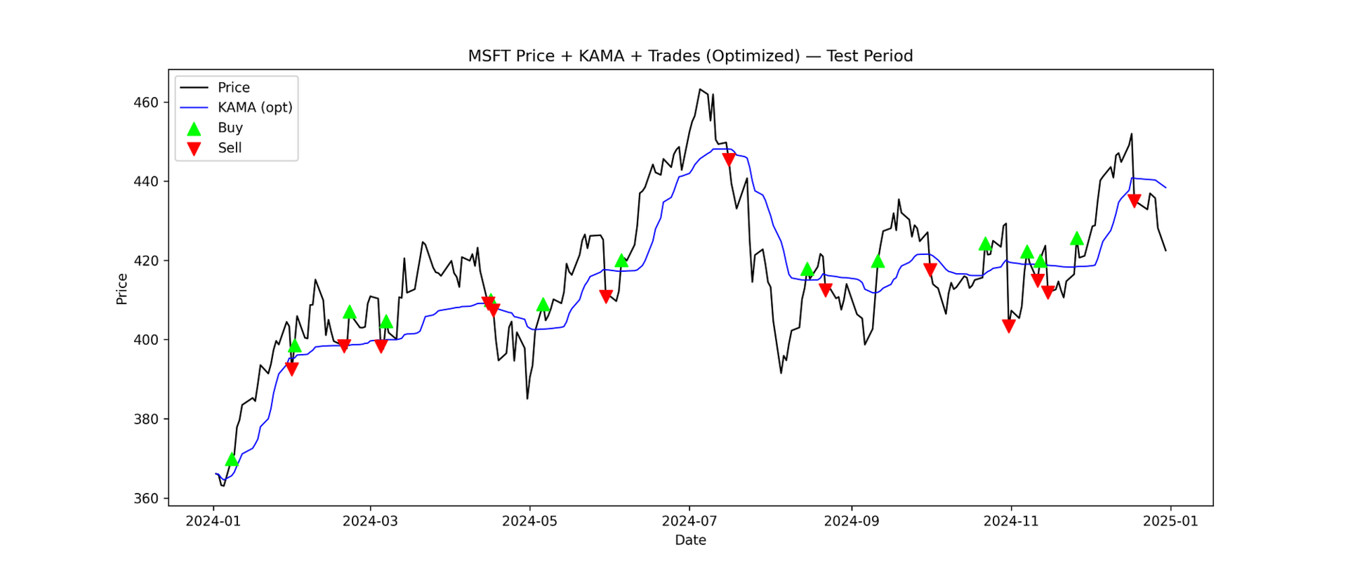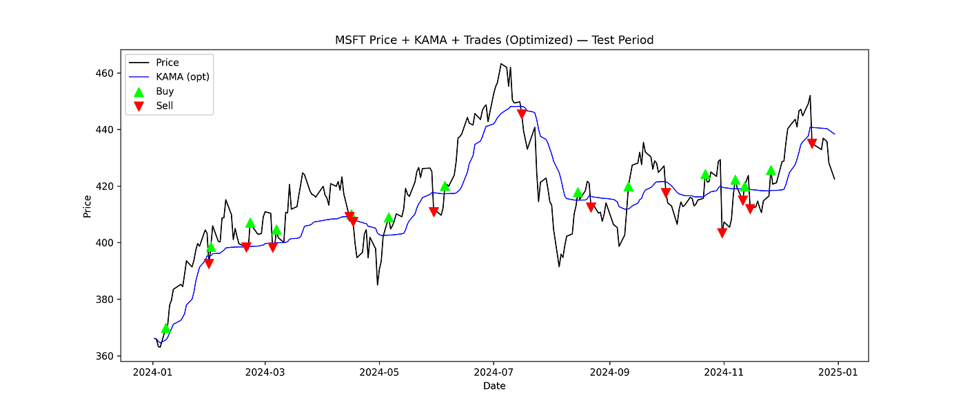 This small gain highlights the inherent challenge of optimizing for out-of-sample performance, especially in relatively flat or low-volatility periods. Still, the optimized KAMA provides a measurable improvement with fewer trades, suggesting more efficient signal generation.