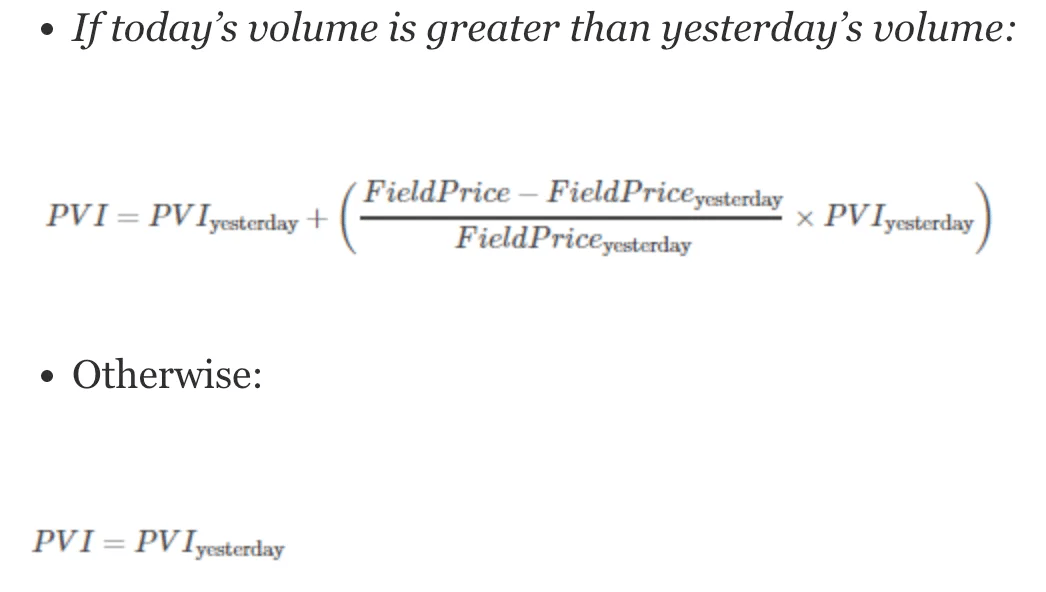 When computing the Positive Volume Index (PVI) for today, we consider the chosen price series, which could be, for instance, the Close Price. If today’s volume exceeds yesterday’s volume, we employ the first formula; otherwise, we utilize the second formula.