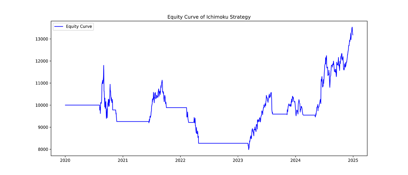 Equity Curve Observation: By looking at the equity curve, you can see that the strategy captures upward trends but also experiences significant drops during downtrends. This is normal for trend-following strategies like Ichimoku.