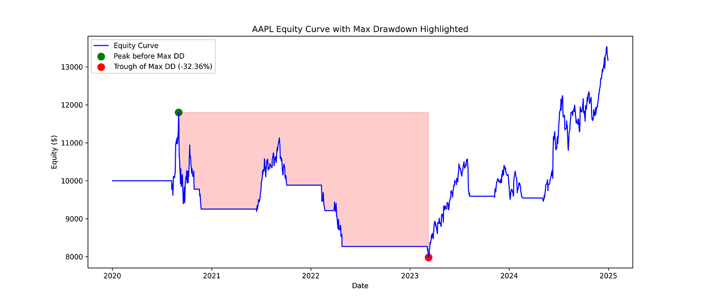 Max Drawdown: The maximum drawdown of -32.36% tells us the largest peak-to-trough loss during this period. Drawdowns are important because they show the risk of losing money at the worst point, even if the final return looks good.