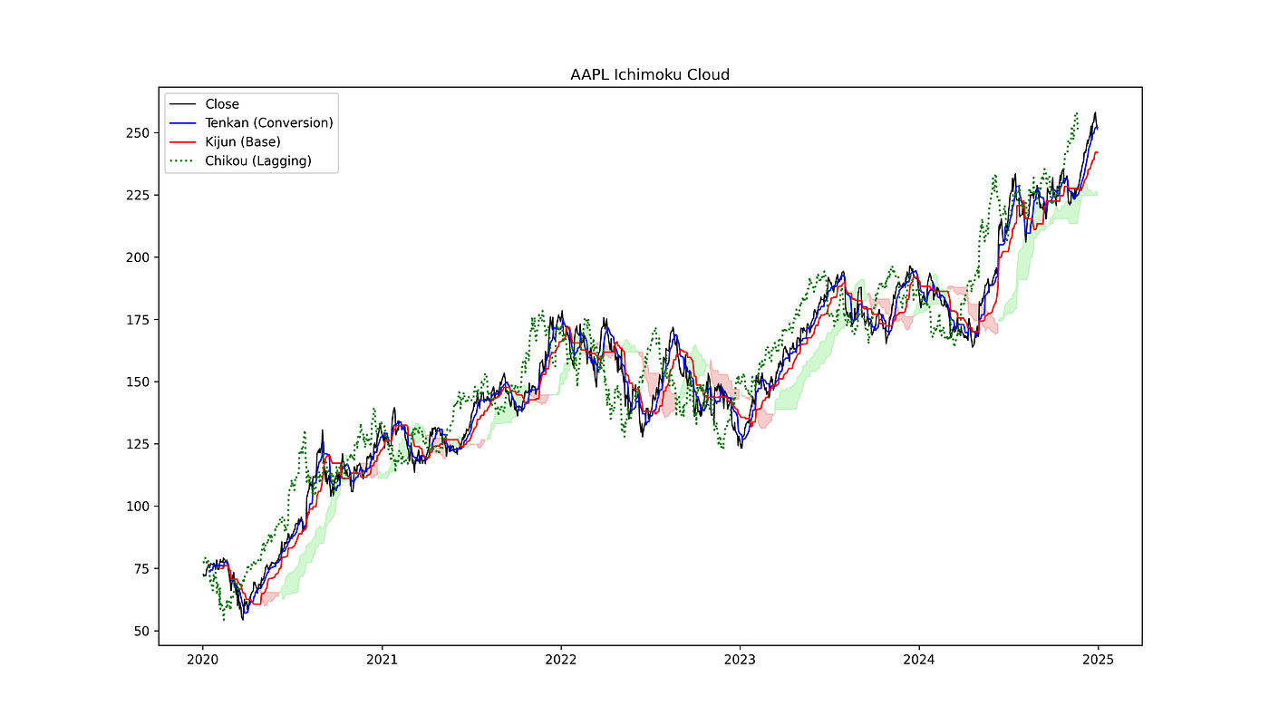 We’ve pulled Open, High, Low, Close, and Volume for Apple over 2020–2024. This gives us the raw data we need to calculate the Ichimoku components.
