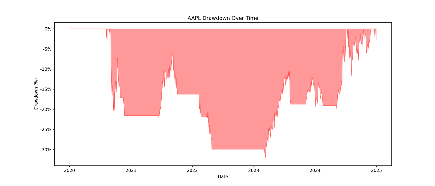 Visualizing the peak-to-trough drop gives an intuitive sense of risk. Even profitable strategies can have periods where your portfolio temporarily loses a large portion of its value.