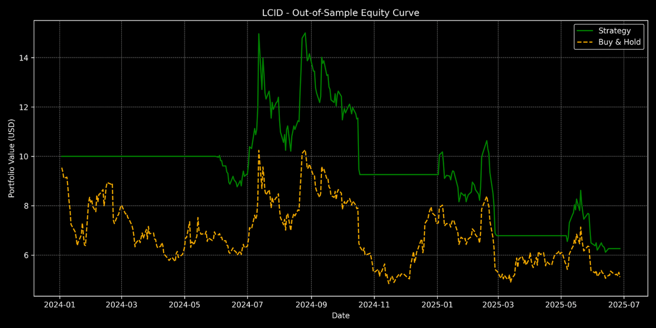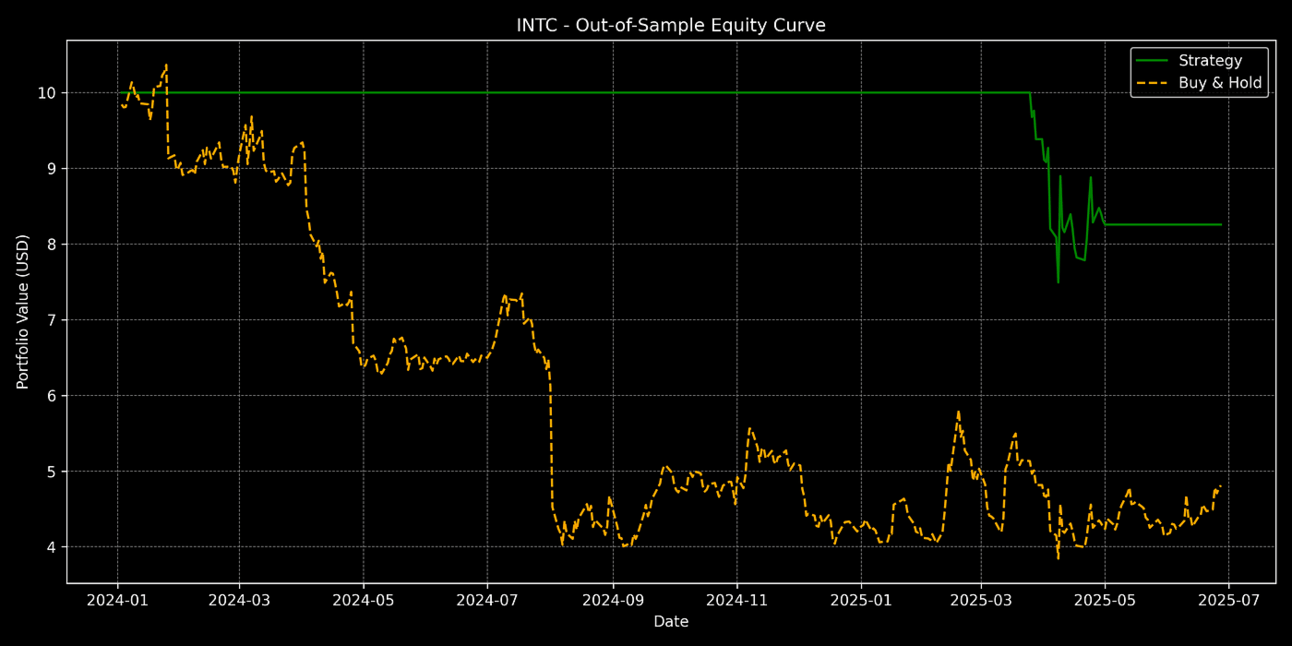 Some stocks, like INTC, LCID, and CIFR, struggled under the strategy, showing negative returns, though Buy & Hold results varied — INTC and LCID also showed losses with Buy & Hold, while CIFR had a small positive return.