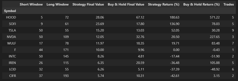 print(f"{symbol} - Best Short Window: {best_short_window}, Best Long Window: {best_long_window}")