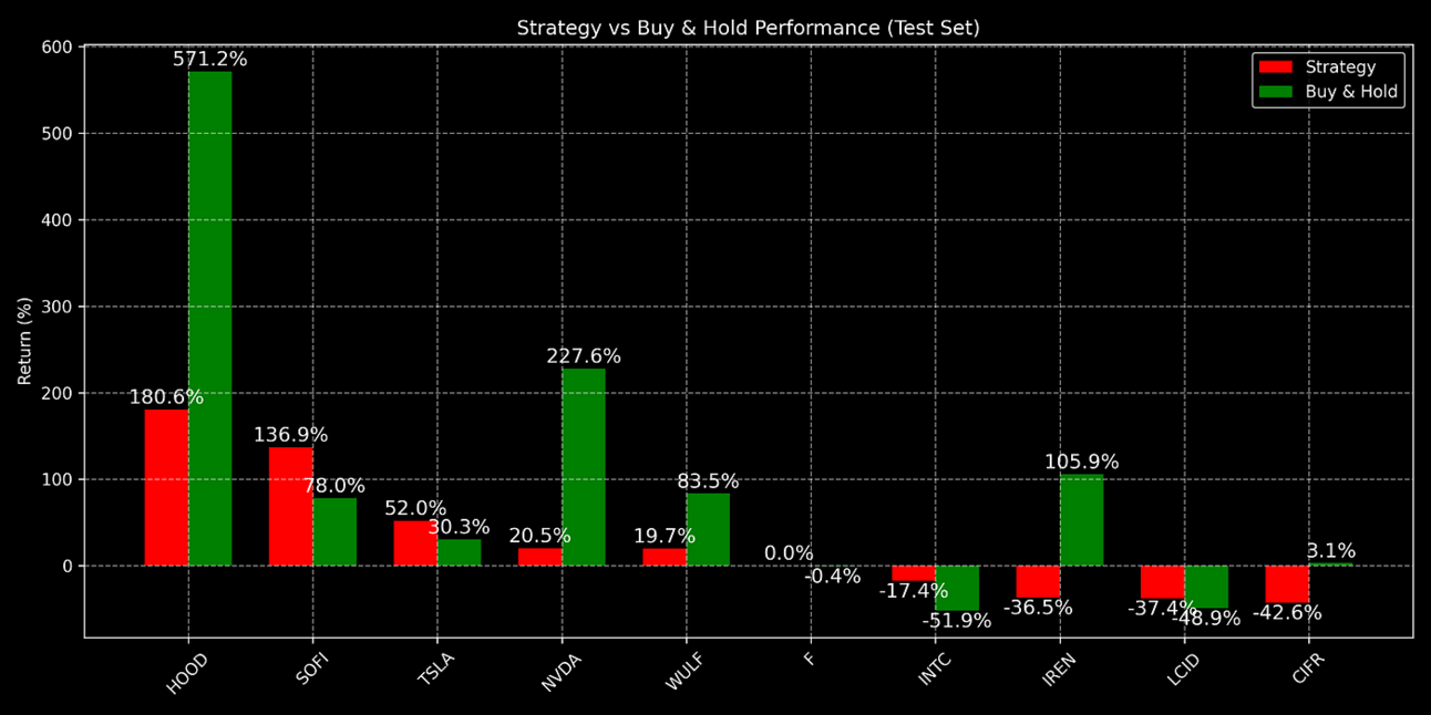 For example, the strategy delivered impressive gains on HOOD and SOFI, generating returns of over 130%, while Buy & Hold returns were mixed — extremely high for HOOD but lower for SOFI.