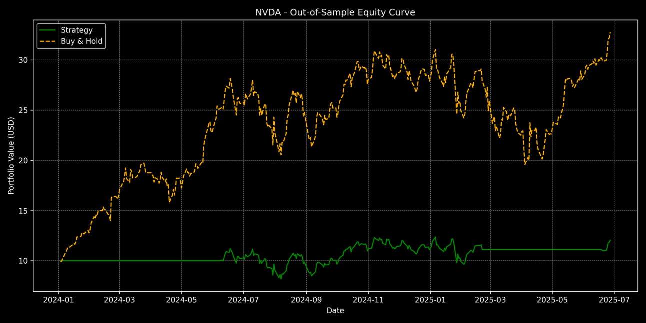On the other hand, NVDA had a strong Buy & Hold return of over 227%, while the strategy’s performance was more modest at around 20%.