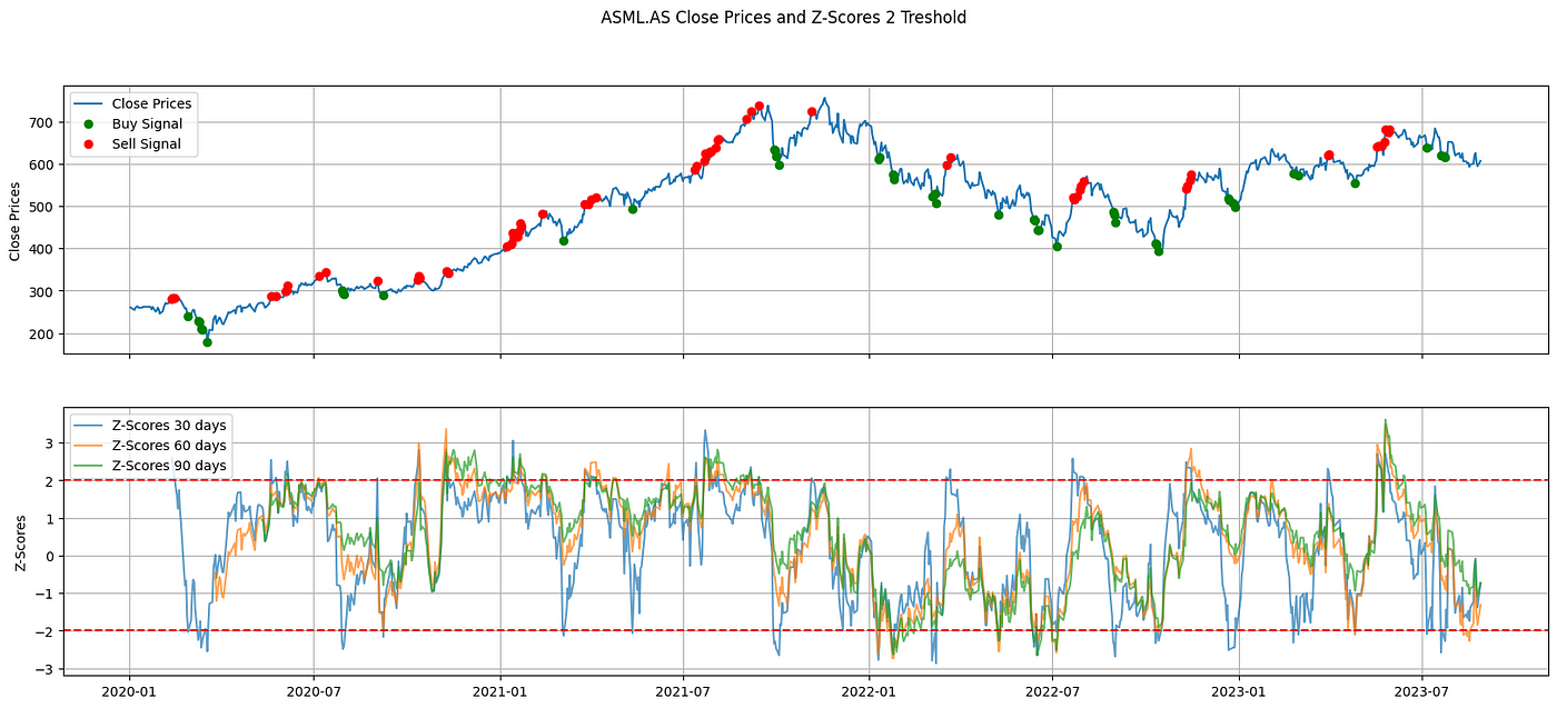 This study juxtaposes the stock price trajectory of ASML.AS with rolling Z-Scores calculated over 30, 60, and 90-day periods. Using clear visual markers, green dots indicate potential buy signals, while red dots signal potential sell opportunities, guided by pre-set Z-Score thresholds.