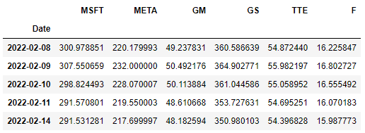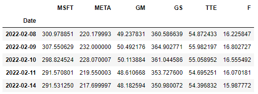 tickers=['MSFT','META','GM','GS','TTE','F']