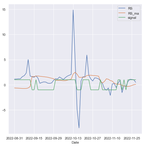 df_rel.query("Date>'2022-08-30' and Date<'2022-11-30'") [['RS','RS_ma','signal']].plot(figsize=(8,8))