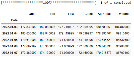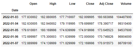 To illustrate this concept, I’ll use a dataframe containing Apple’s historical stock prices. Details on how the dataset was obtained using Python will be shared at the conclusion of this guide.
