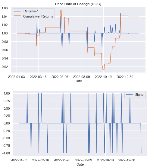 df['Sell'] = (df['ROC'] < 0) & (df['ROC'].shift(1) > 0)# Buy securities when a buy signal is generated and sell them when a sell signal is generated