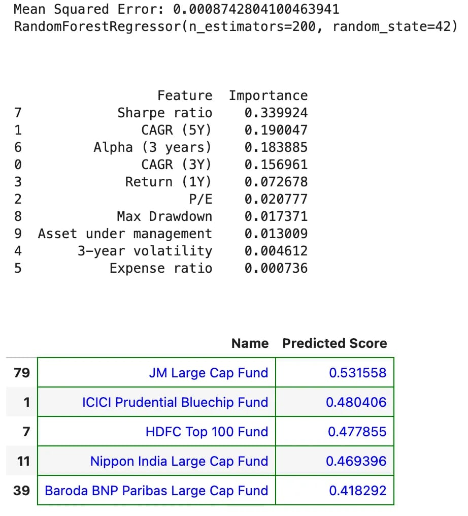 This is where machine learning comes into play. Using the Random Forest Regression model, we can analyse multiple factors — returns, risk, expenses, P/E ratio, and more — and predict which funds will likely outperform in the future.
