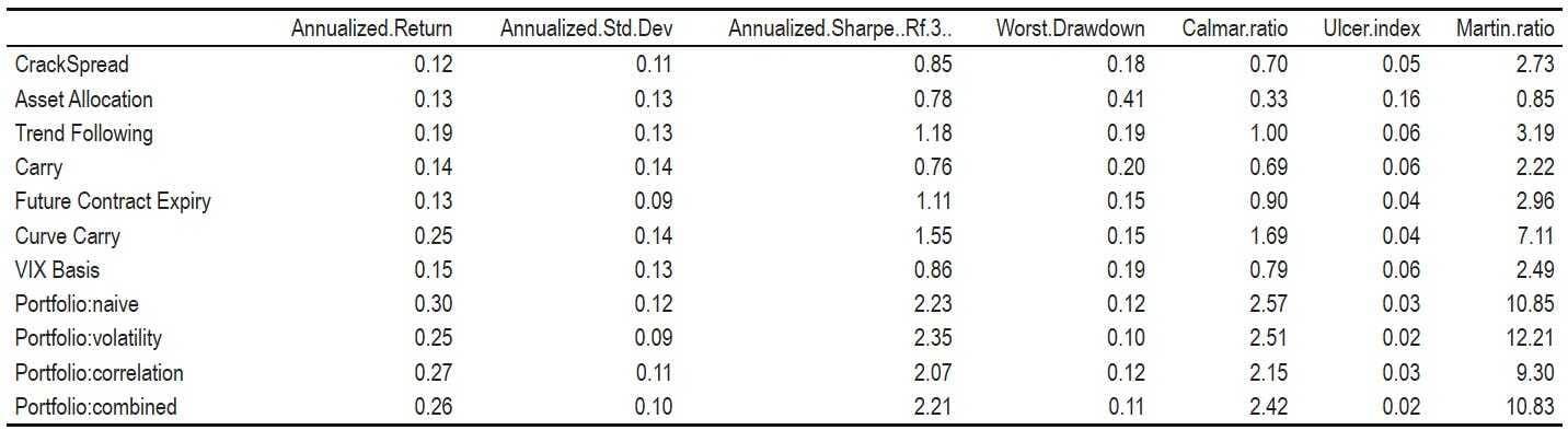 All the above strategies are implemented with Futures, except the relative value one, which trades stocks. The above strategies don’t deliver a great risk/reward individually but the combination does.