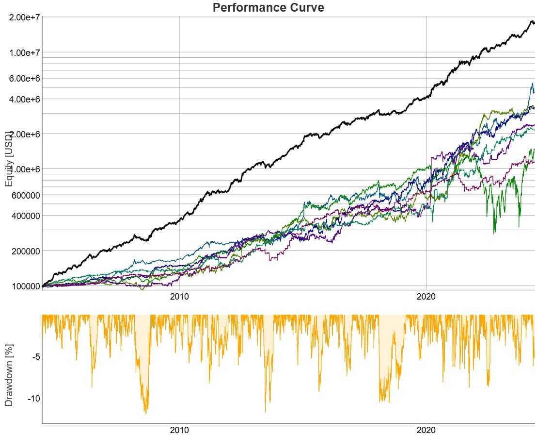 Note how during drawdowns, some strategies can lose most or even more than the money they made historically up to that point. This is because we progressively increase the cash allocated to each strategy as our portfolio value increases.