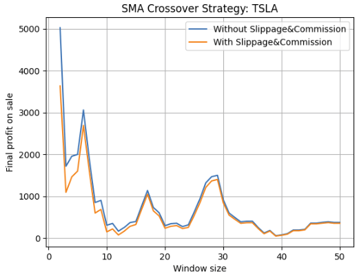 I ran the same SMA backtest twice — once with trading costs, and once without — across different window size from 2 to 50.