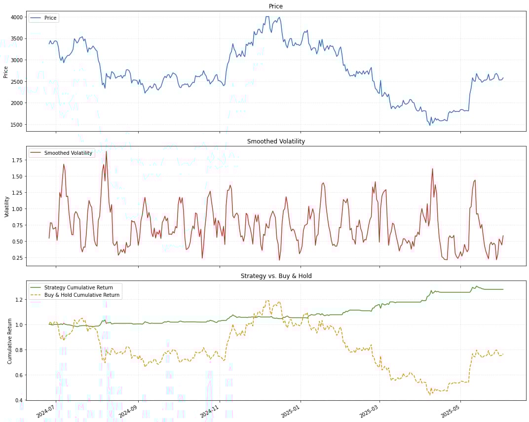 verbose: bool = FalseThis structure allows users to easily tweak everything from the ticker and data period to intricate details of how volatility clusters are defined and traded. The strategy initializes by fetching historical data using yfinance and then proceeds to feature engineering.